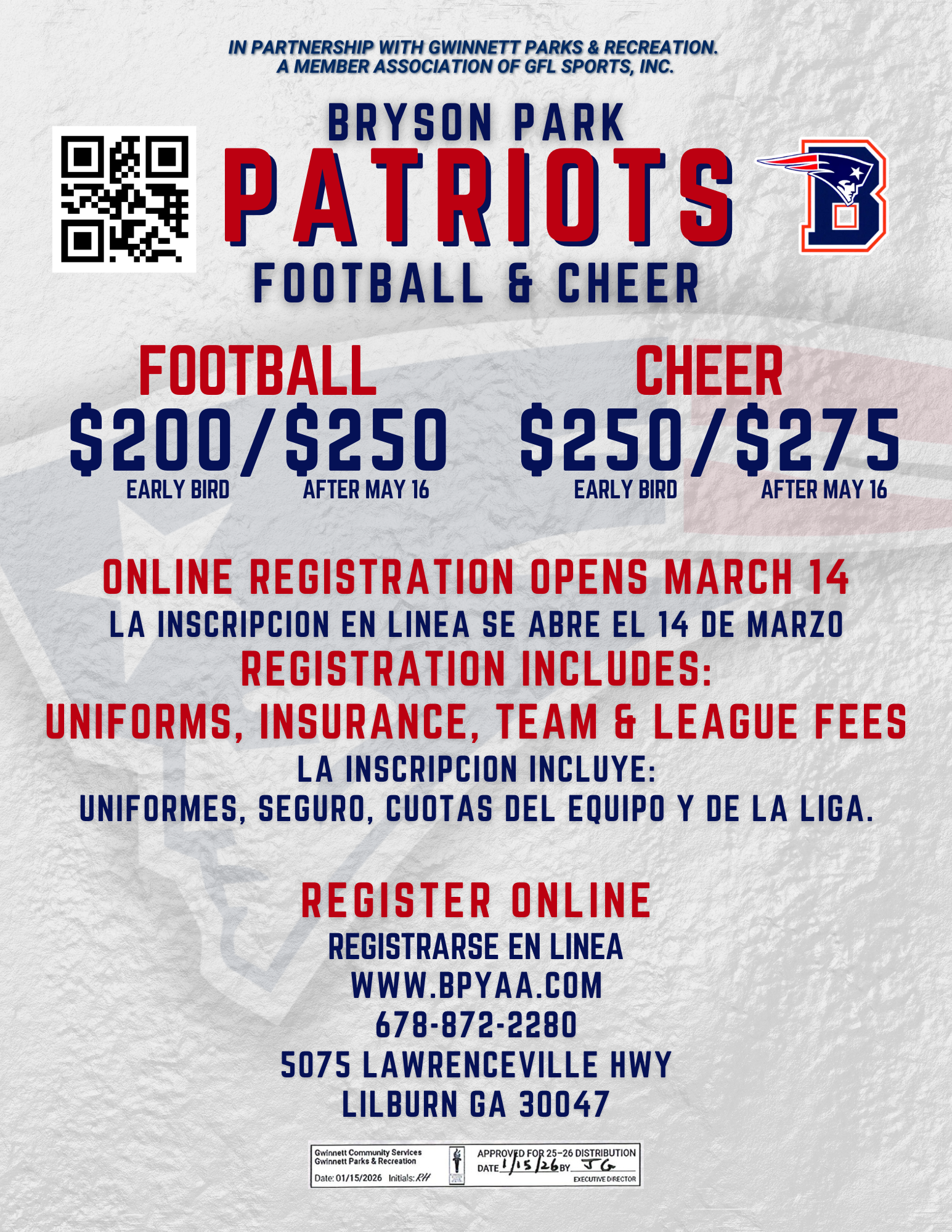 📢 Exciting News! 7v7 and Flag Football registration is open NOW! Tackle Football and cheer will be opening March 14, 2026!!